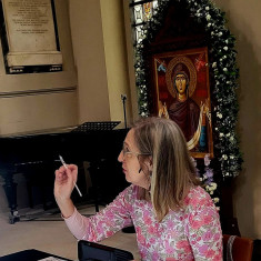 On 19 October members of the South London Lettering Association again took part in the Bloomsbury Festival by demonstrating calligraphy inside St George’s Church. The scribes worked for an hour or two each on their own projects using different tools and styles of lettering, taking the theme of the 2024 Bloomsbury Festival – Human.Kind – to inspire them. Visitors were able to learn about calligraphy and talk to the calligraphers, both amateur and professional, and have a go themselves, guided by experienced calligraphers.